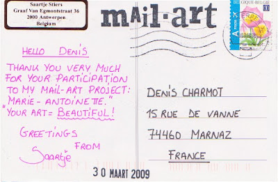 Carte postale de l' artiste Belge Saartje Stiers de Antwerpen en Belgique reçu le 01/04/2009. Saartje a un projet: Marie - Antoinette, Queen of France que tu peux voir sur ma page mail art call sans date limite.Postcard of the Belgian artist Saartje Stiers from Antwerpen in Belgium received the 01/04/2009. Saartje has a project: Marie - Antoinette, Queen of France that you can see on my page mail art call without deadline.